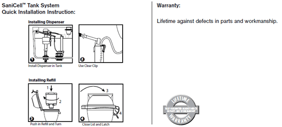 The compact SaniCellTM Tank system discreetly installs in almost any tank toilet. Simply hang the dispenser, place the delivery tube in the overflow pipe, and insert the refill.