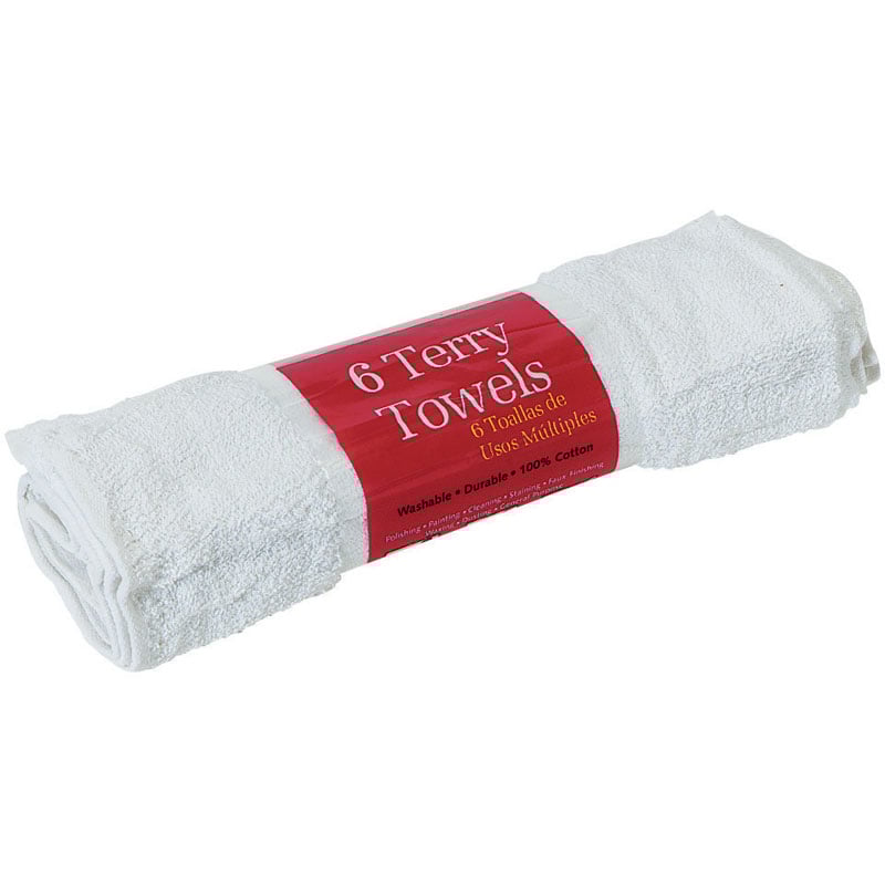100% cotton terry towels are extra absorbent and convenient. These terry towels are washable and durable for reuse. Includes six 14" x 17" white towels.