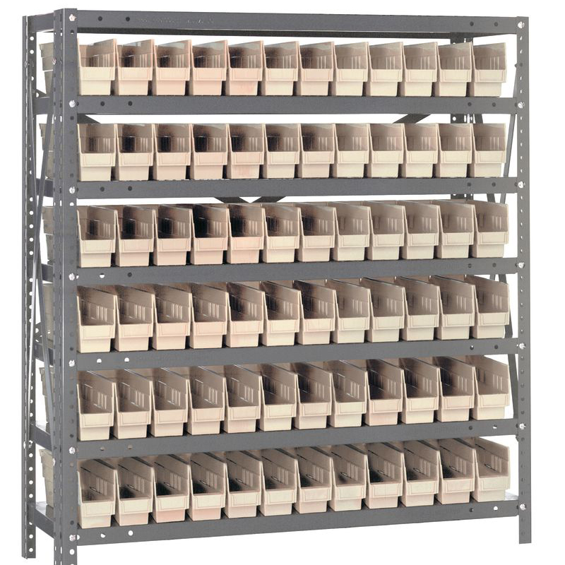 Organize your workspace with the Quantum Heavy-Duty Shelving Unit, sized 12"D x 36"L x 39"H. This durable ivory shelving system features 7 sturdy shelves and includes 72 storage bins for efficient parts and tools organization. Ideal for warehouses, workshops, and garages, it offers high load capacity and easy access to stored items. The compact footprint makes it perfect for tight spaces while maximizing vertical storage. With a sleek ivory finish and industrial-grade construction, this shelving unit provides a reliable, long-term storage solution for any commercial or professional setting.
