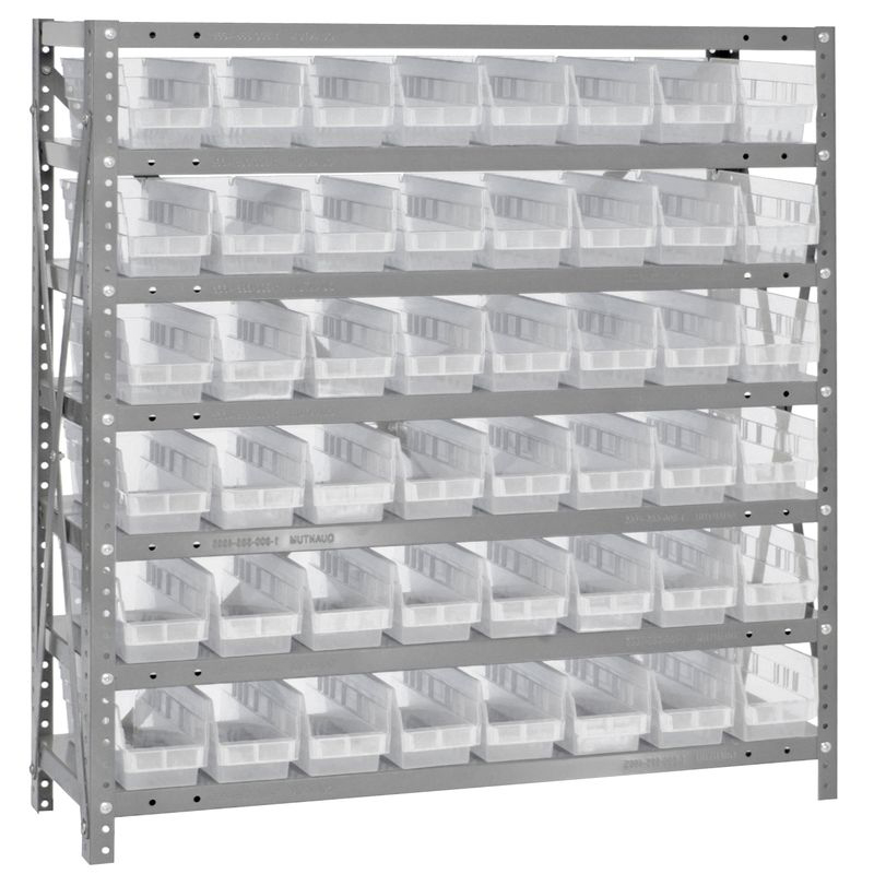 Optimize your storage space with the Quantum Heavy-Duty Shelving Unit, measuring 12"D x 36"L x 39"H. This robust clear shelving system features 7 strong shelves and includes 48 durable bins, perfect for organizing small parts, tools, or supplies. Ideal for garages, workshops, and industrial settings, the unit offers high weight capacity and easy access to stored items. Its compact design makes it suitable for areas with limited space, while the sleek clear finish adds a professional touch. Built for long-lasting performance, this complete storage solution helps keep your workspace clean, efficient, and ready for action.