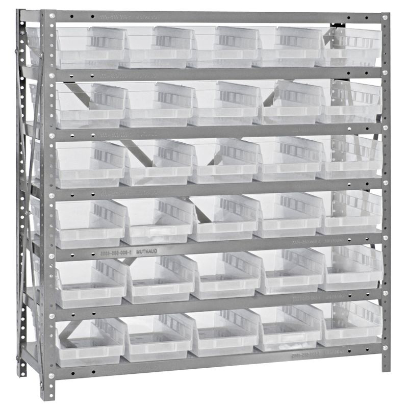 Streamline your storage with the Quantum Heavy-Duty Shelving Unit, 12"D x 36"L x 39"H. This durable clear shelving system features 7 sturdy shelves and comes complete with 30 industrial-grade bins, making it ideal for organizing tools, hardware, or supplies. Perfect for use in garages, warehouses, or workshops, the compact unit offers high load capacity and efficient vertical storage. The included bins provide quick access and clear organization, helping you maintain a neat and productive environment. With its space-saving design and rugged construction, this shelving solution is built to deliver long-term durability and dependable performance in any professional setting.