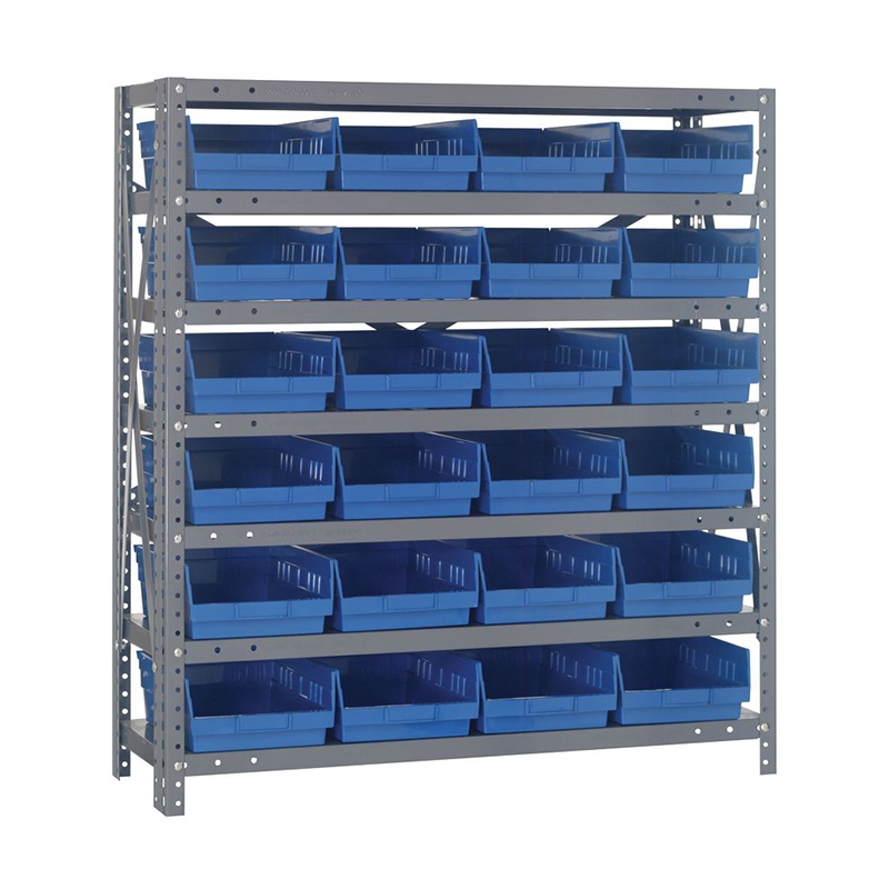 Keep your workspace organized with the Quantum Heavy-Duty Shelving Unit, measuring 12"D x 36"L x 39"H. This sturdy blue shelving system includes 7 durable shelves and 24 industrial-grade bins, ideal for storing tools, parts, and small components. Perfect for garages, stockrooms, or maintenance areas, the unit offers high load capacity and space-saving vertical storage. The included bins provide easy access and clear organization, helping you work more efficiently. Built for long-lasting performance, this shelving unit features a sleek blue finish and rugged construction, delivering a reliable storage solution for both commercial and industrial environments.