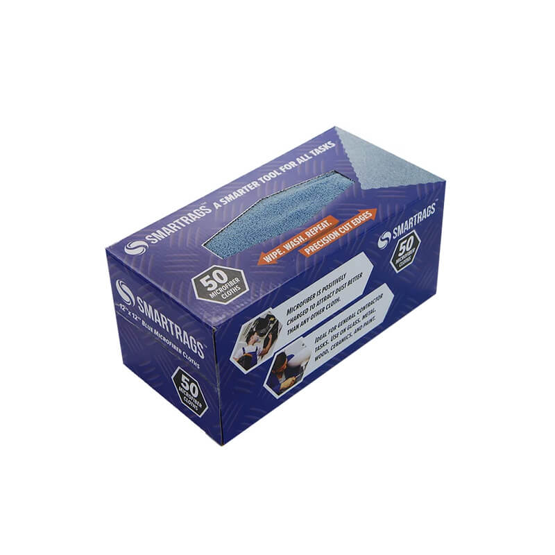 Each SmartRag dispenser box contains 50 12 X 12 microfiber cloths with precision cut seamless edges. Color-coding reduces the threat (and perception) of cross-contamination. Smaller and more compact than regular microfiber cloths, SmartRags are ideal for utility carts, corporate supply rooms, automotive shops, and break rooms. SmartRags are less expensive than regular microfiber cloths so are ideally used in high-loss environments: