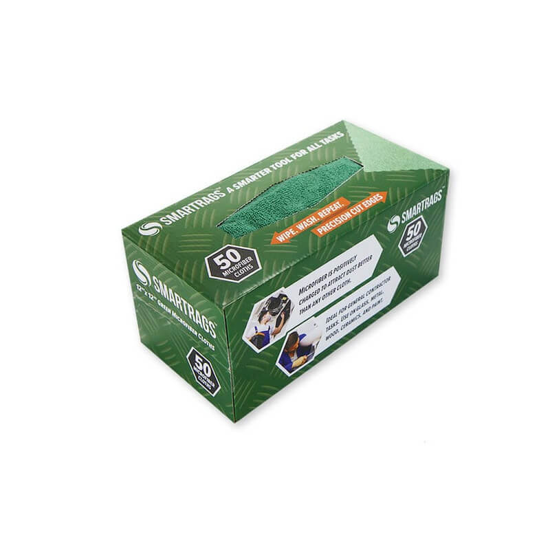 Each SmartRag dispenser box contains 50 12 X 12 microfiber cloths with precision cut seamless edges. Color-coding reduces the threat (and perception) of cross-contamination. Smaller and more compact than regular microfiber cloths, SmartRags are ideal for utility carts, corporate supply rooms, automotive shops, and break rooms. SmartRags are less expensive than regular microfiber cloths so are ideally used in high-loss environments: