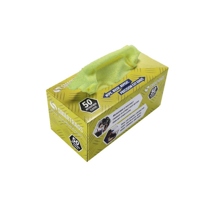 Each Smart Rag dispenser box contains 50 12 X 12 microfiber cloths with precision cut seamless edges. Color-coding reduces the threat (and perception) of cross-contamination. Smaller and more compact than regular microfiber cloths, SmartRags are ideal for utility carts, corporate supply rooms, automotive shops, and break rooms. SmartRags are less expensive than regular microfiber cloths so are ideally used in high-loss environments: