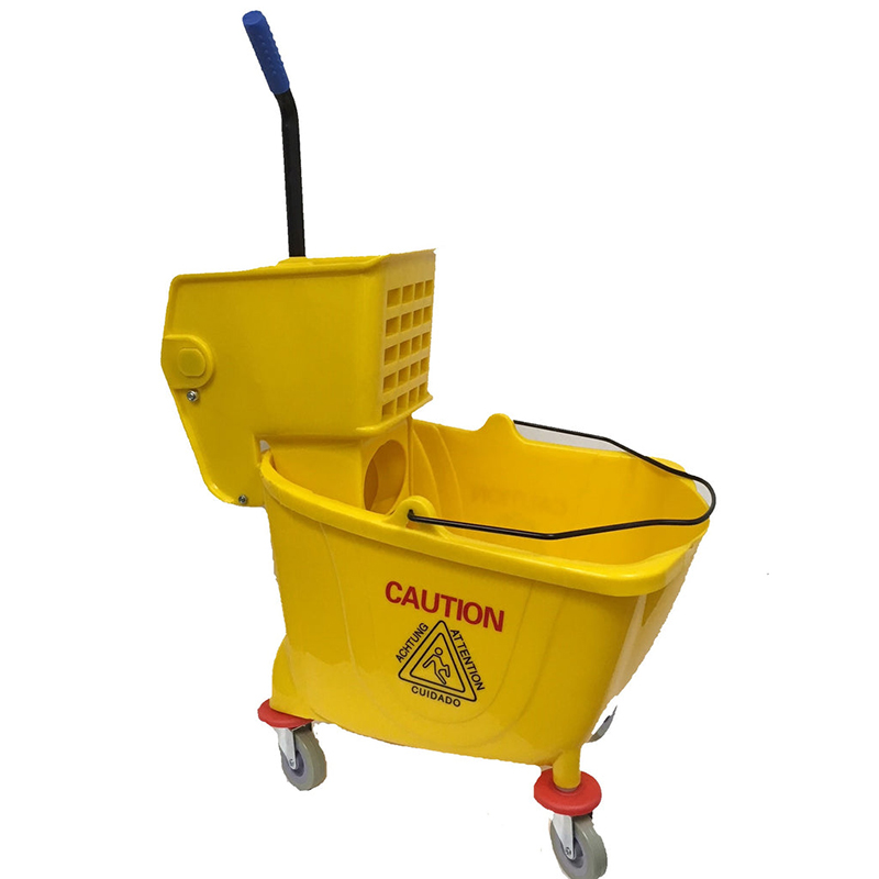 The Better Brush Mop Bucket & Wringer, with a 35-liter capacity, is a robust and efficient solution for commercial and industrial cleaning tasks. This durable yellow bucket is designed with a built-in wringer to effectively squeeze out excess water, improving mopping efficiency and reducing user effort. Its sturdy construction ensures long-lasting performance, while the ergonomic handle and smooth-rolling wheels allow for easy maneuverability. Ideal for use in large spaces such as schools, offices, and warehouses, this mop bucket offers convenience and reliability. The bright yellow color enhances visibility, promoting safety in busy environments.
