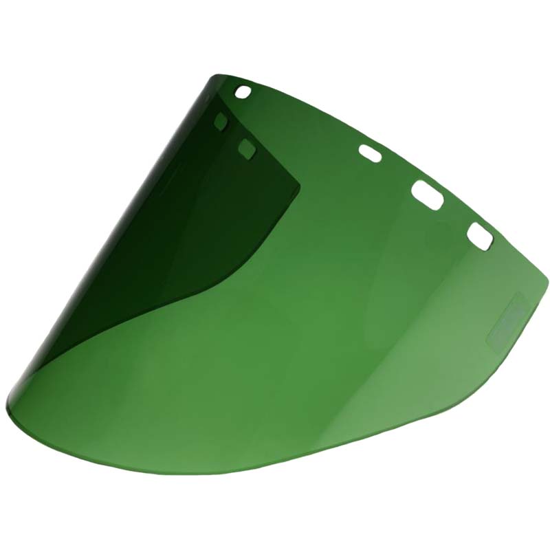 An injection molded shield measuring 10" x 20" x .060". The multi-fit attachment consists of 7 slot hole pattern designed to fit a large variety of headgear. The molded in bead and formed shape, improve comfort and safety considerations.