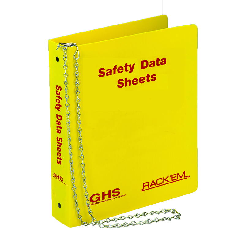 3-Ring Binder to keep safety data sheets organized and easy to reference. Covers available in English only and in tri-lingual with English, Spanish, and French translation. Binder covers are made from durable polyurethane and have a 36″ chain and 1 pair of sheet lifters.
