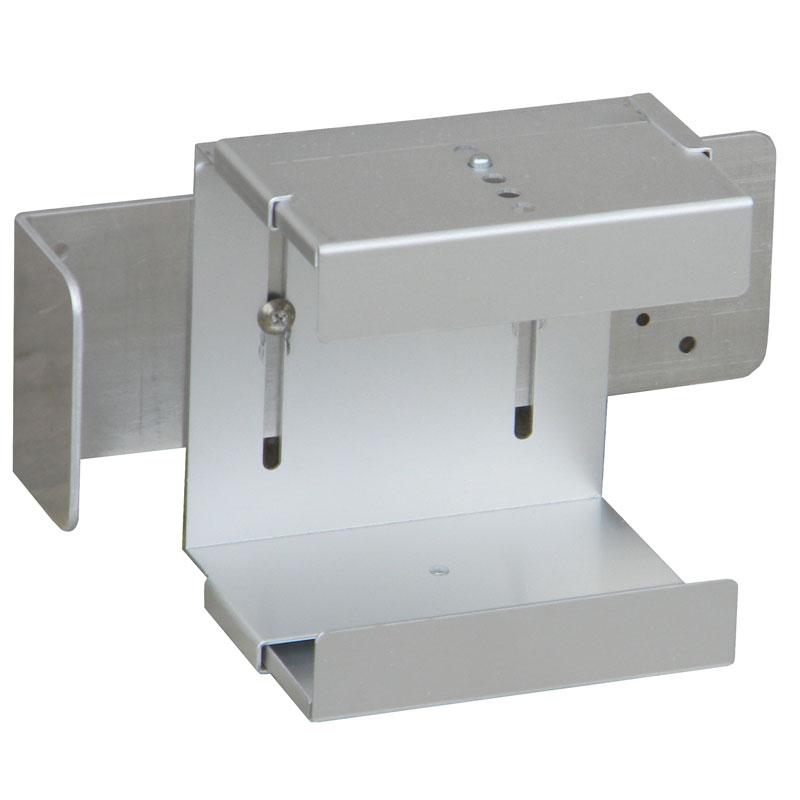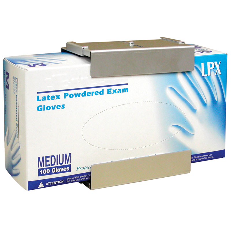 Constructed of durable aluminum and easily accomodates any glove box size. This adjustable sized glove box holder can accommodate one glove box and is simpel to load. Can be mounted vertically or horizontally on a variety of surfaces. The glove box holder secures the box and will take up no more space than the box itself.