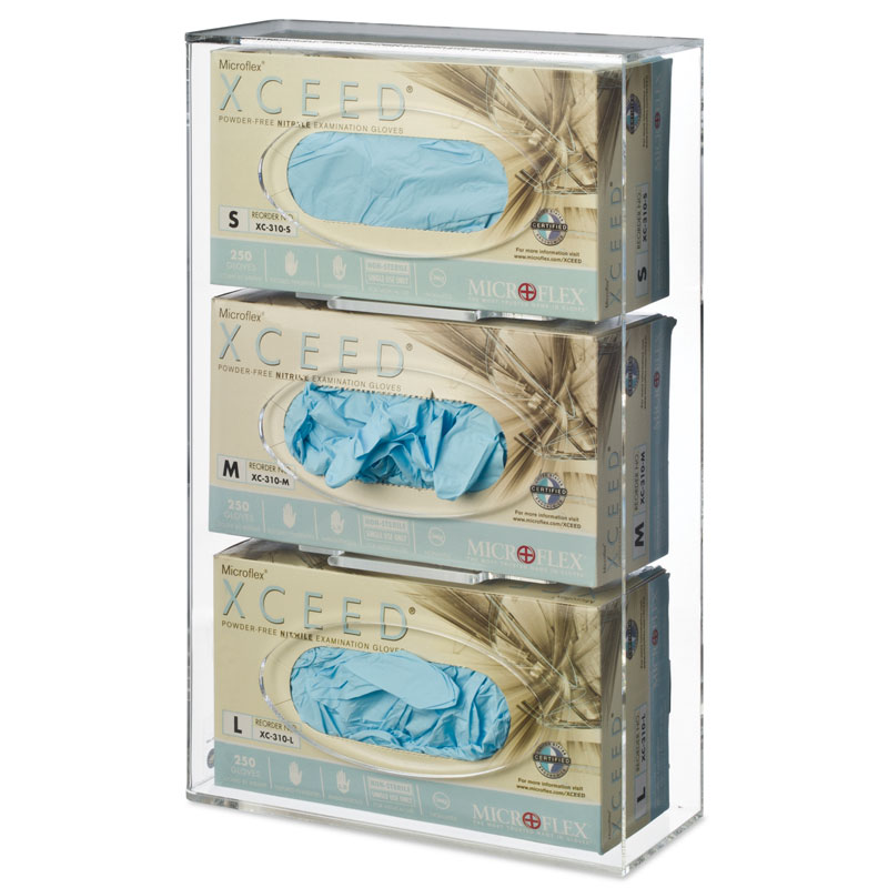 Restocking glove boxes can be bothersome, especially when it is the bottom box that is empty. This inventive side-loading glove box holder has molded dividers that are incredibly strong and durable to keep each glove box separated from the other. The side-loading dispenser makes switching out a fresh glove box for an empty one simple and fast.