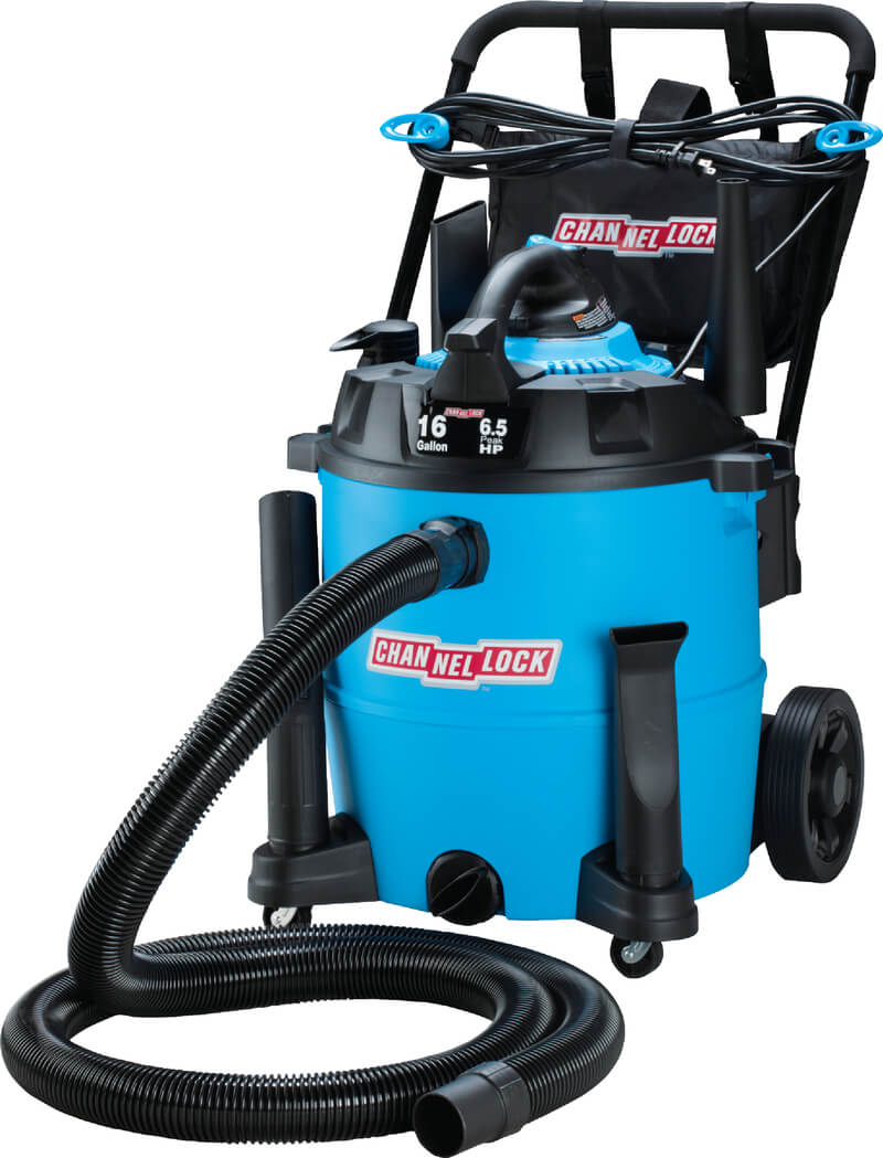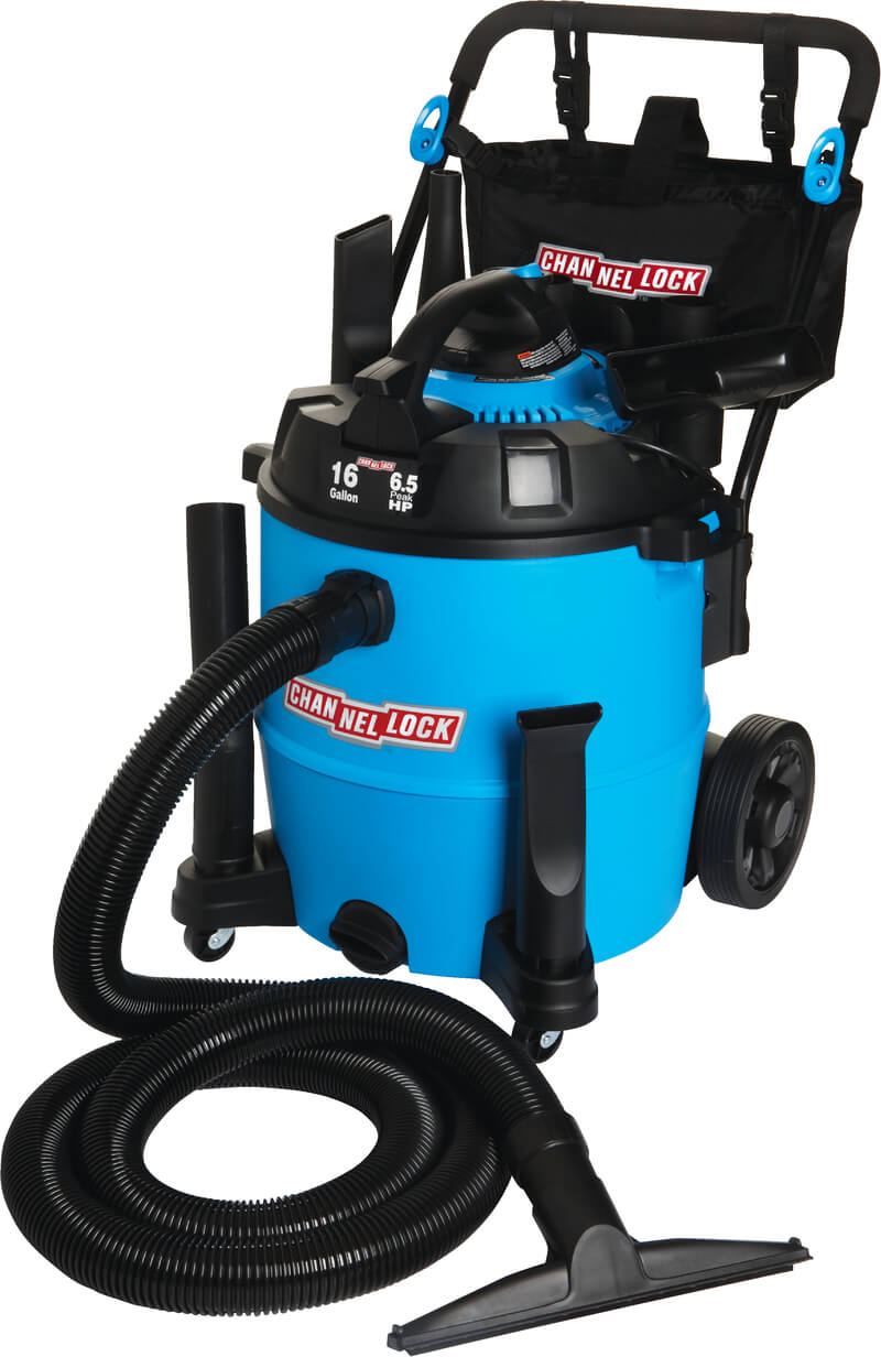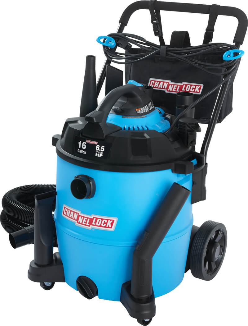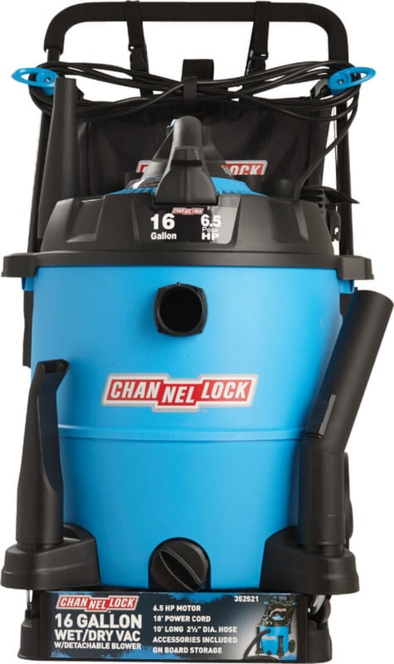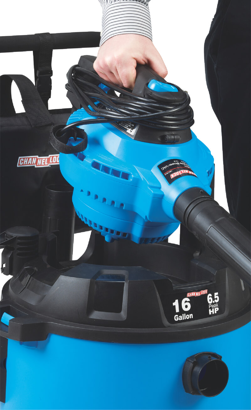 This Channellock wet/dry vacuum comes complete with a 16 gallon*, 6.5HP** wet/dry high-performance vac with 265 MPH detachable blower and 18 Ft. power cord. Features on-board storage, top handle with cord organizer, large rocker switch, and 1-button release for the blower. Also includes contour air control handle. Equipped with 10 Ft., 2-1/2 In. hose. Includes (2) extension wands, utility nozzle, crevice tool, cartridge filter, foam sleeve, blower adapter and nozzle, concentrator nozzle, and noise diffuser. Nozzle 141 CFM***, Motor 150 CFM***, Water Lift 62 In.*** Vac has easy-roll casters. *"Tank Size" refers to the actual tank volume, and does not reflect capacity available during operation. **"Peak Horsepower" is a term used in the wet/dry vacuum industry for consumer comparison purposes. It does not denote the operational horsepower output of a wet/dry vacuum, but rather the horsepower output of a motor, including the motor's inertial contribution, achieved in laboratory testing. In actual use, motors do not operate at the peak horsepower shown. ***CFM, Water Lift, and Air Watts tested to ASTM standard at the end of included hose.