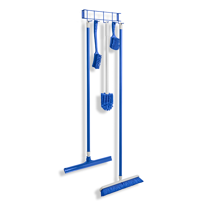 Color coding sanitation utensils reduces the spread of bacteria. Color coded rack prevents mixing cleaning utensils from different areas of the plant. Use different colored cleaning utensils in different areas of the food plant to reduce the spread bacteria and disease in food plants. Cross contamination reducing racks for HACCP compliance (HACCP – Hazard analysis and critical control points). Holds brushes, brooms, scrapers, scoops, shovels, mops, and squeegees on strong 2.5″ long hooks. Keeps tools together in one area, for one machine or for one operation. One inch spacing from wall allows cleaning behind rack. Made to withstand daily cleaning with bleaches, common acids, bases and solvents used in sanitizing food plants & found in chemical plants. NOTE: Rack shown with floor tools and equipment tools for photography only. DO NOT MIX FLOOR TOOLS AND EQUIPMENT TOOLS ON RACK IN THE PLANT.