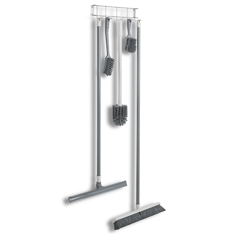 A 16" storage rack to reduce the spread of bacteria by mixing cleaning utensils from different areas of the plant. The hook rack is made of durable stainless steel for industrial work environments. The storage rack holds brushes, brooms, scrapers, scoops, shovels, mops, and squeegees on strong 2.5" hooks.