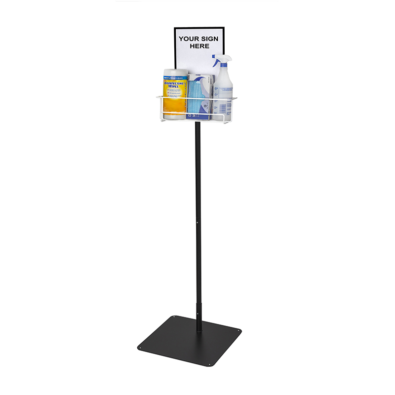 Dispense Disposable Masks, Hand Sanitizer, Hand Sanitizing Wipes, Trigger Spray Bottles and more from this stand with sign.