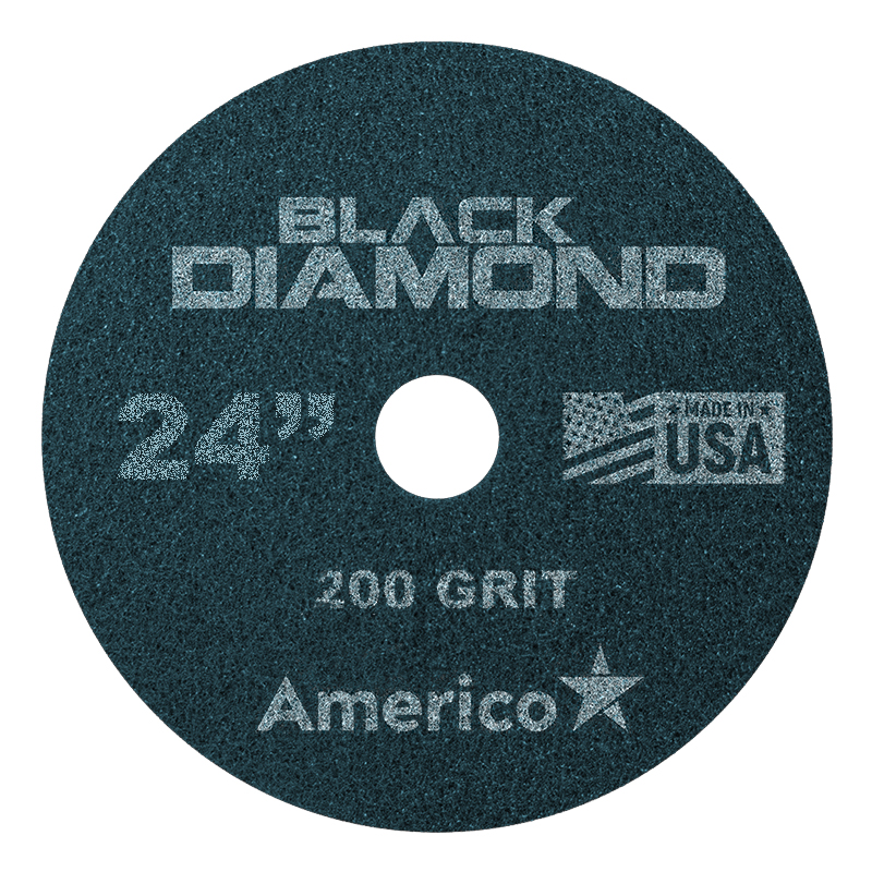 The toughest restoration jobs call for the toughest floor pad. The Black Diamond 200 grit diamond pad is specially formulated for heavy-duty cleaning of worn concrete and stone floors. Our proprietary Integrated Matrix Technology™ combines the abrasive power of industrial diamonds with a stiffer, more aggressive base web designed for intense restorations. The Black Diamond 200 grit pad’s enhanced cutting capability effectively removes scratches and stains, leaving a clean, matte surface prepared for the subsequent Black Diamond steps.