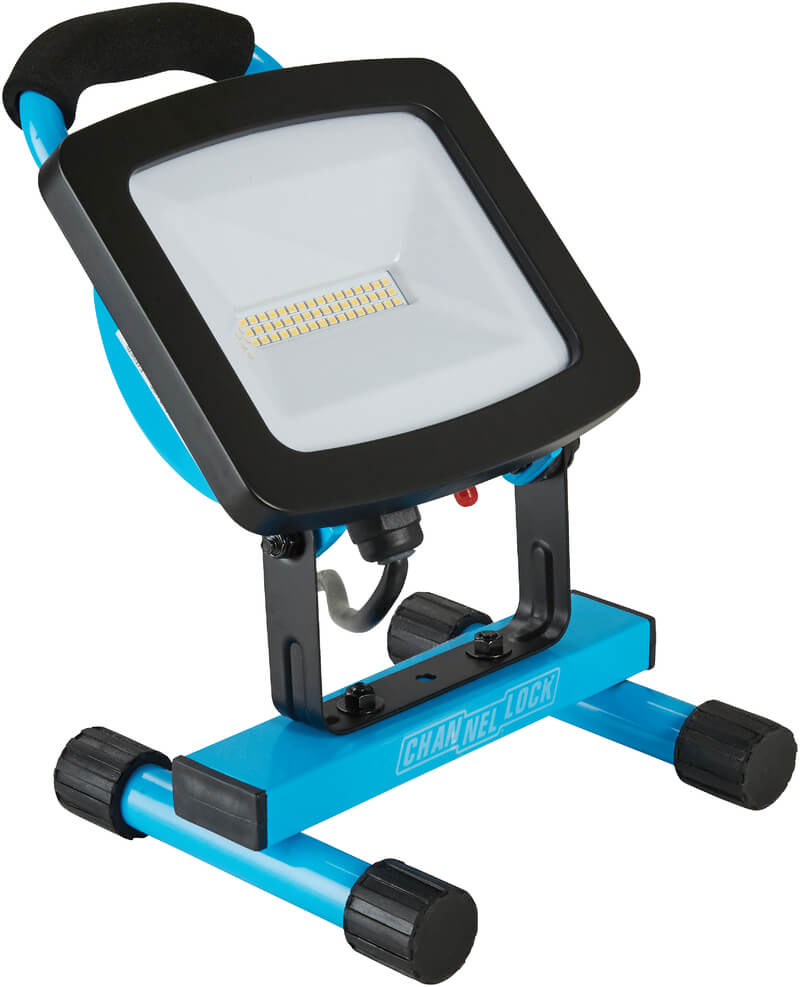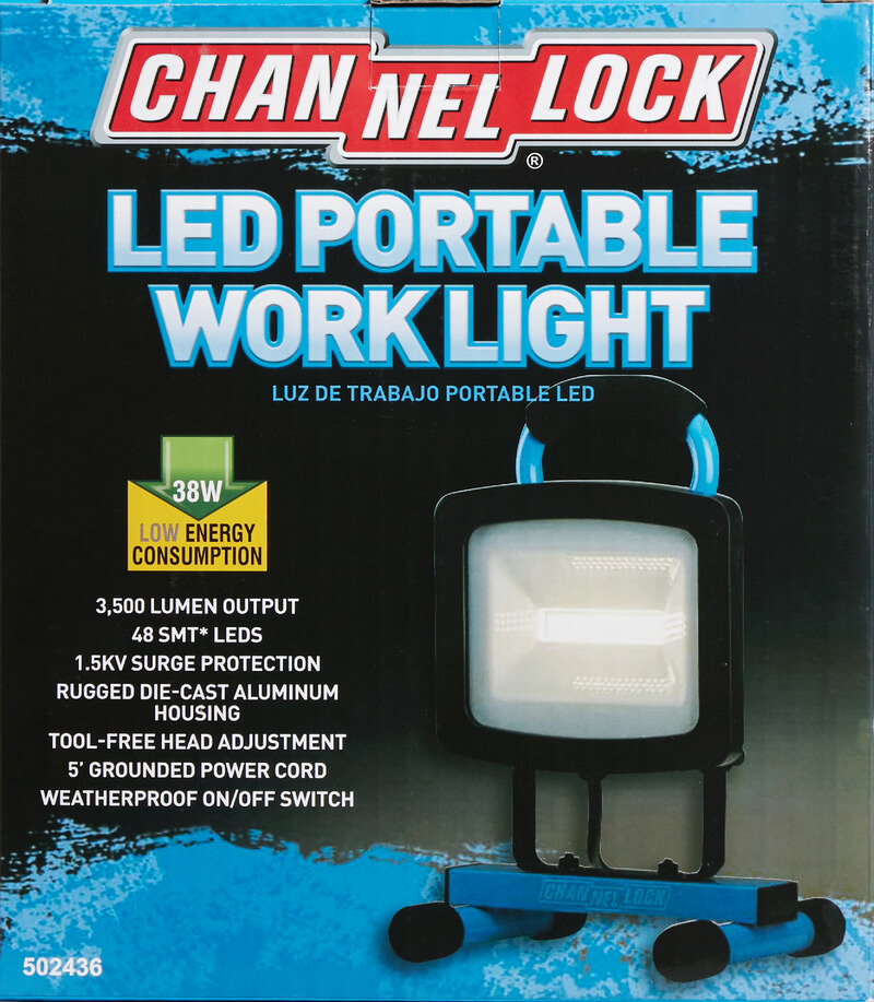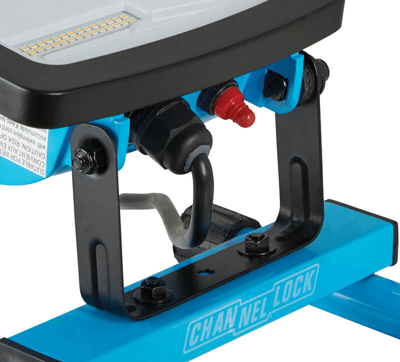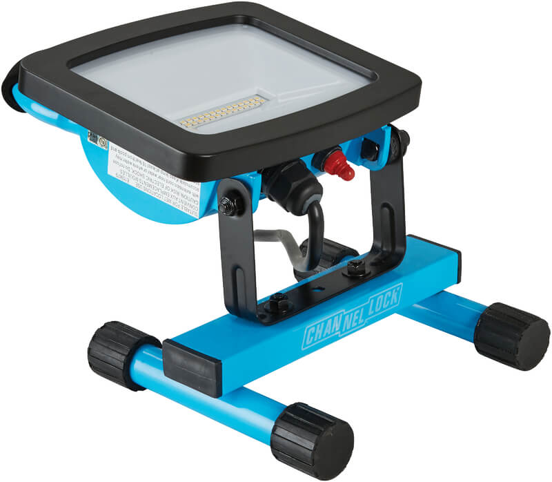 H-stand work light featuring 48 ultra-bright LED (light emitting diode) bulbs. Rugged die-cast aluminum housing with a steel H-stand and non-slip feet. Tool-free ratcheting head tilts up and down. Includes convenient carry handle for portability. Weatherproof, on/off switch, and 5-foot power cord. Lifetime limited warranty.