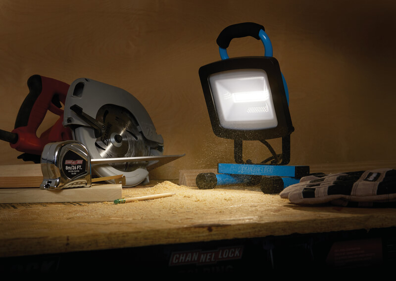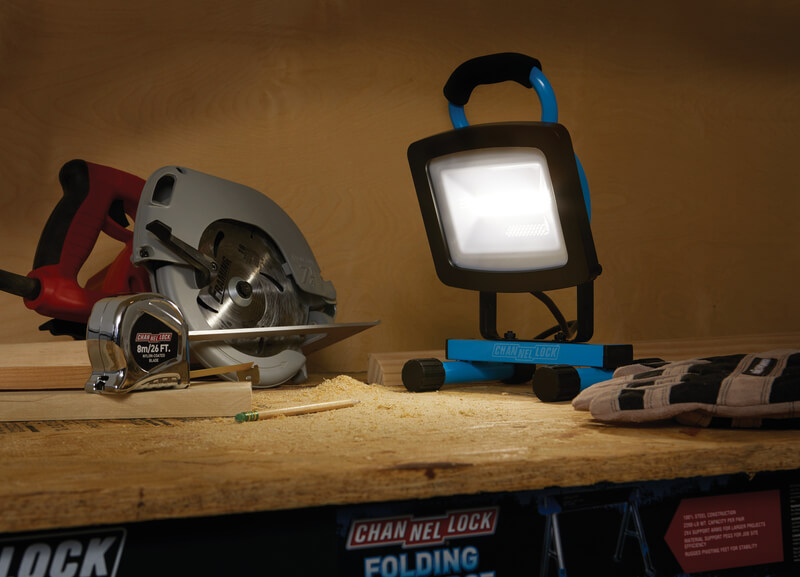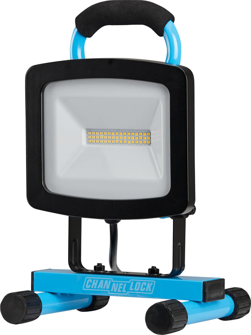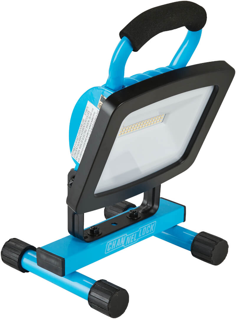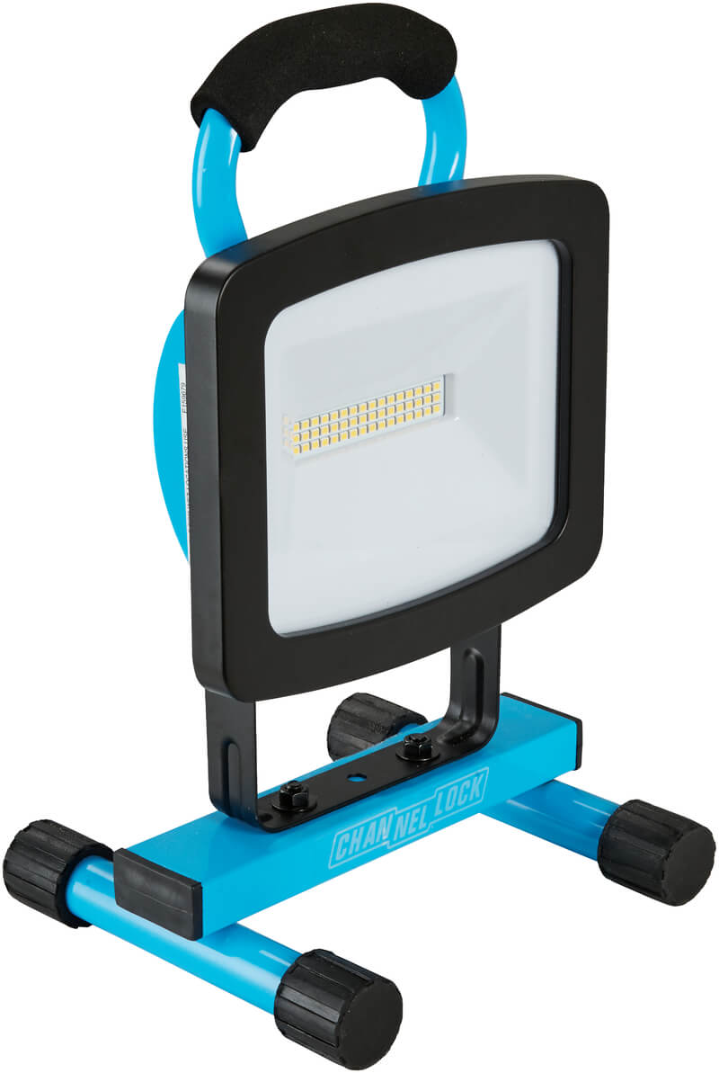 H-stand work light featuring 48 ultra-bright LED (light emitting diode) bulbs. Rugged die-cast aluminum housing with a steel H-stand and non-slip feet. Tool-free ratcheting head tilts up and down. Includes convenient carry handle for portability. Weatherproof, on/off switch, and 5-foot power cord. Lifetime limited warranty.