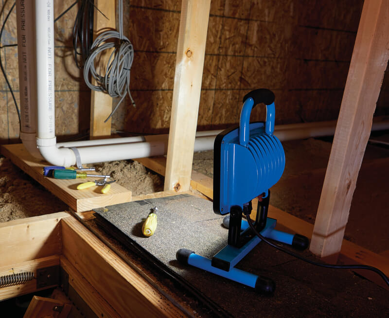 H-stand work light featuring 90 ultra-bright LED (light emitting diode) bulbs. Rugged die-cast aluminum housing with a steel H-stand and non-slip feet. Tool-free ratcheting head tilts up and down. Includes convenient carry handle for portability. Weatherproof on/off switch and 5 Ft. grounded power cord. 1.5KV surge protection. Lifetime limited warranty.