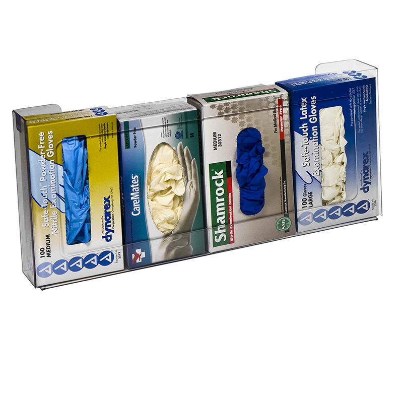 Wall mount. Organize latex, vinyl and nitrite exam gloves for quick and easy access. Hold all glove sizes used in one convenient rack. Load with multiple quantities of fast moving gloves to reduce refill frequency and out-of-stocks. Holds all manufacturers’ glove boxes. Racks do not collect dust and dirt.