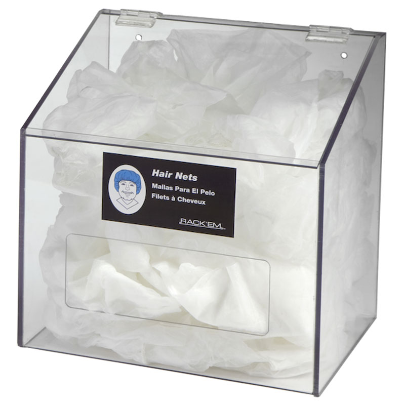 The clear acrylic dispenser features slip-resistant rubber feet for mounting on a table or shelf and holes for mounting on the wall. The unit includes labels: hair nets, beard covers, shoe covers, arm protectors, and a blank customizable white label. Illustrated labels have a caricature showing the item in use, and tri-lingual wording (English, Spanish, French Canadian) to insure worker compliance.