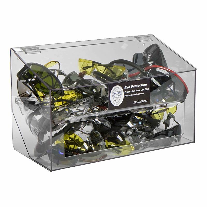 Holds up to 70 pairs of safety glasses. Table or wall mounts for easy access. Clear acrylic with clear lid.