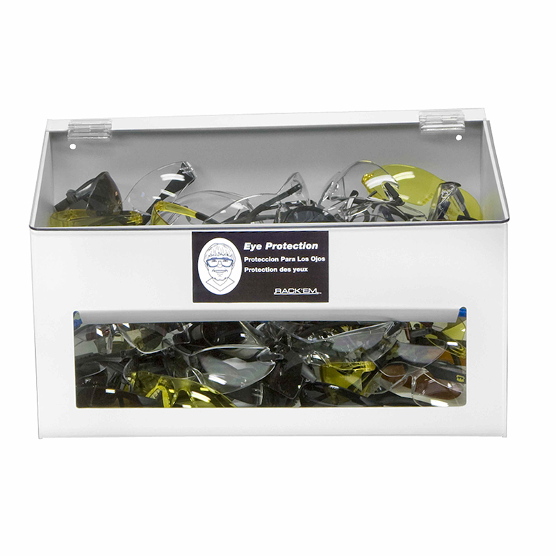 Holds up to 70 pairs of safety glasses. Table or wall mounts for easy access. White plastic with clear lid.