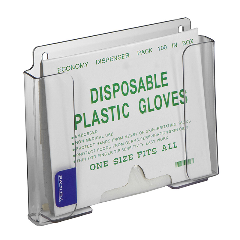 Enhance your workspace hygiene with the Rack'Em Poly Glove Dispenser. This clear, compact unit keeps your gloves organized and easily accessible. Its sleek design fits neatly in any space, ensuring that clean, ready-to-use gloves are always within reach. Simplify safety with Rack'Em.