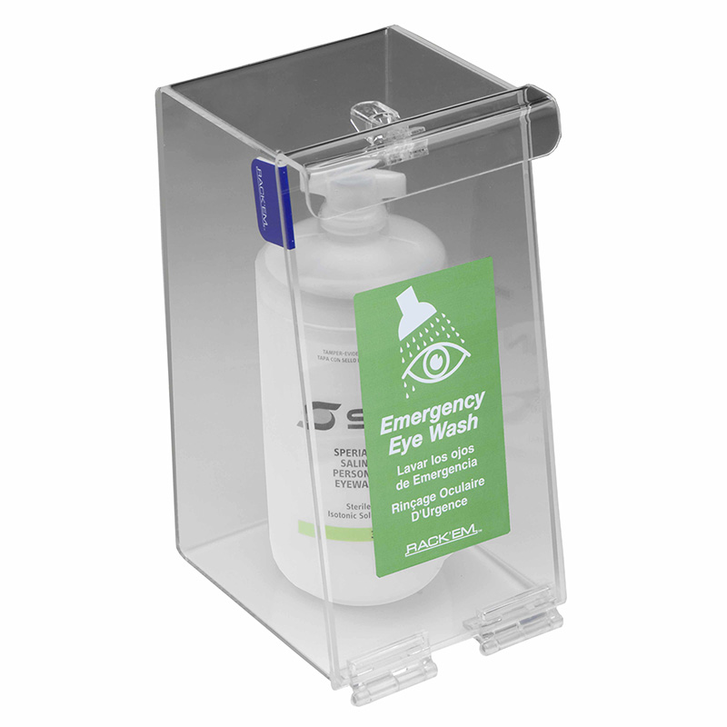 Single bottle eyewash station in clear acrylic. Holds 1 bottle of eyewash flush.