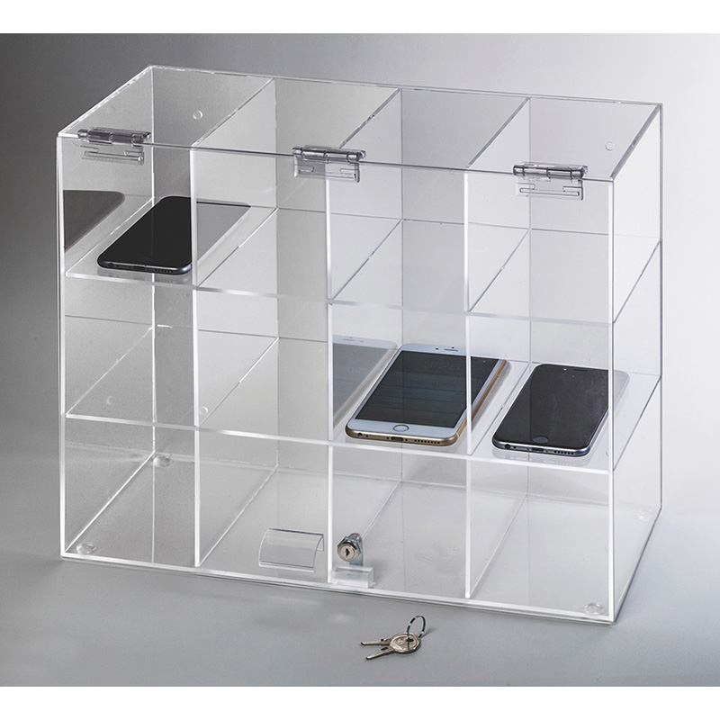 Lock & Store 12 cell phones or goggles, CLEAR PLASTIC Table or wall mount for easy access, foam bottom. Individual compartment Dim: 3.25″W x 3.75″H x 7.375″D. Overall Dim:12.25″H x 14.25″W x 7.75″ D (key included)