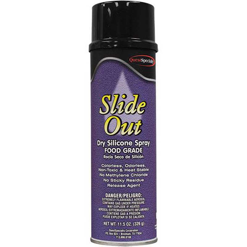 SLIDE OUT Dry Silicone Spray Food Grade is designed to lubricate equipment used in the packaging and processing industry. Slide Out leaves a non-staining, dry, pure silicone film to lubricate moving parts, reducing friction and wear. NSF H-1.