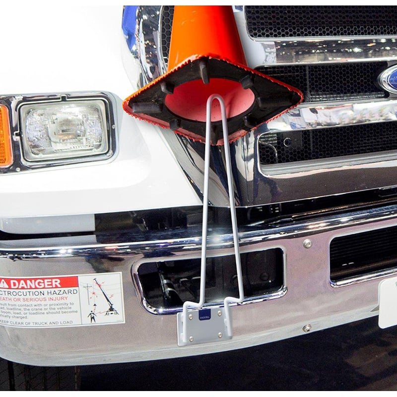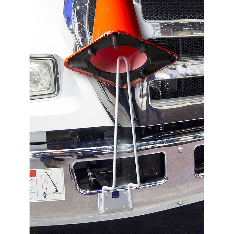 Traffic Safety Cone Holder. (Vertical Mount) Bolts onto truck bumpers or frames for convenient storage of traffic cones. Fits 18″ and 28″ cones. White, 4 holes for mounting.