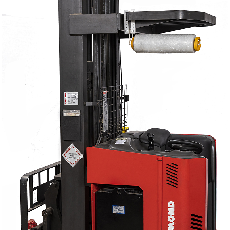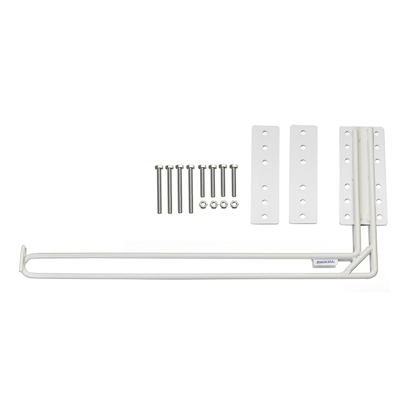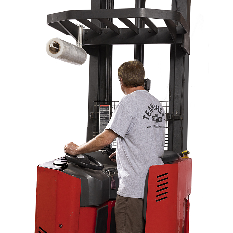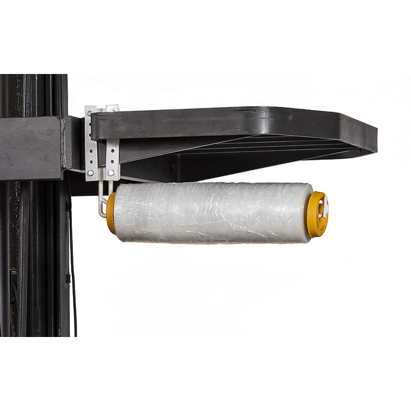 Fork Lift Stretch Wrap Rack – Horizontal Mount. Bolts onto Fork Lift for convenient storage of Stretch Wrap Roll. Fits 18″ rolls. White, Mounts with 4 bolts, no drilling required. *Includes short & long screws. *Patent pending.