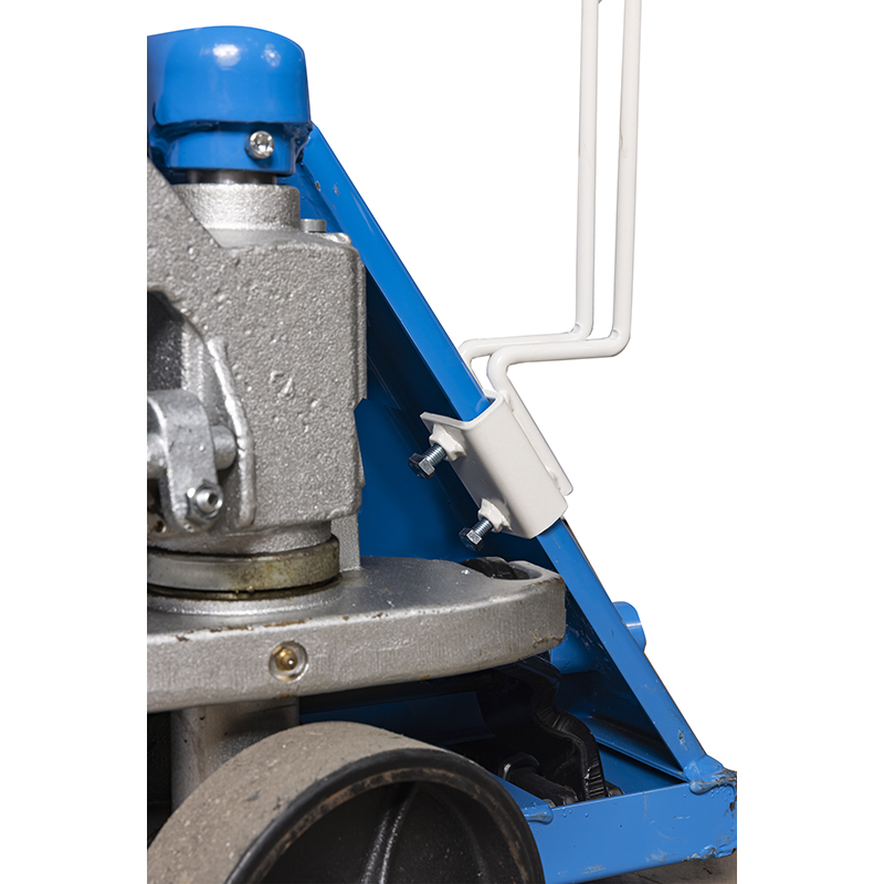 Optimize your workspace with the Pallet Jack Stretch Wrap Rack – Vertical Mount. This innovative rack bolts securely onto your pallet jack, offering a convenient and efficient way to store fits 18″ stretch wrap rolls. White, mounts with 2 bolts no drilling required, it mounts easily using the included short and long screws. The sleek white design blends seamlessly into any environment, enhancing both functionality and aesthetics. Engineered for simplicity and durability, this rack is perfect for quick access and organized storage on the go. Streamline your operations with our patent-pending solution for stretch wrap management.