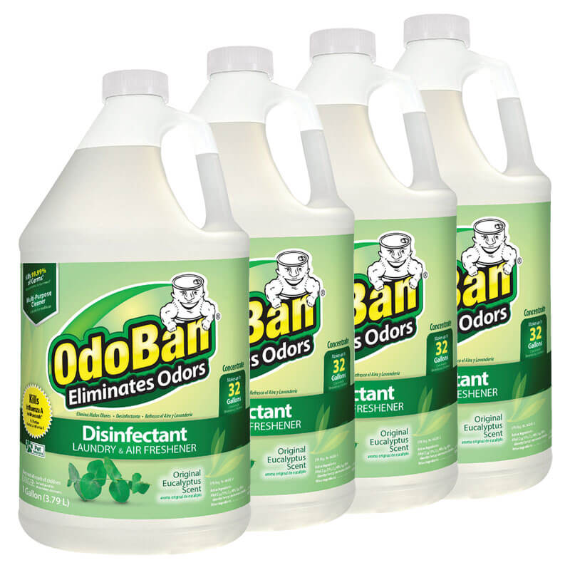 This Odor Eucalyptus Washable Surface Sanitizer & Deodorizer Concentrate cleans, disinfects, sanitizes, and deodorizes all precleaned hard, nonporous household surfaces, it is also an air freshener, fabric laundry refresher, and eliminates the growth of mold and mildew. This OdoBan product also eliminates unpleasant odors on washable surfaces such as upholstery, carpets, bedding, showers, walls, and floors while leaving a fresh scent. This industrial liquid odor eliminator leaves no residue and has a variety of uses. It Kills 99.99% of germs and is a great product for fire and flood restoration.