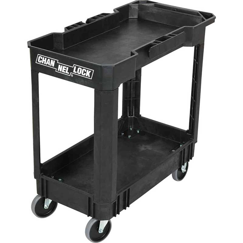 Channellock heavy-duty utility cart. Durable design features 2 shelves for storage, 1 cord reel, and 1 tool organizer. Also includes 5 In. rubber casters that swivel. Easy to assemble.