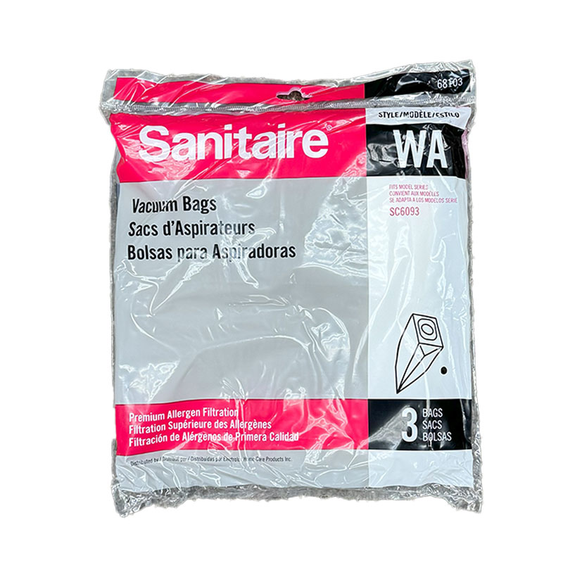 This case of Sanitaire 68103 wide area vacuum bags includes 10 packs of 3 bags. It is designed for use with the Sanitaire SC6093A wide area vacuum cleaner, which cuts down on the time conventional uprights take to clean large areas by up to 50%. When used with vacuum, these bags are easy to insert and act as a liner for vacuum's outer bag. For optimum use, store in a clean, dry place.