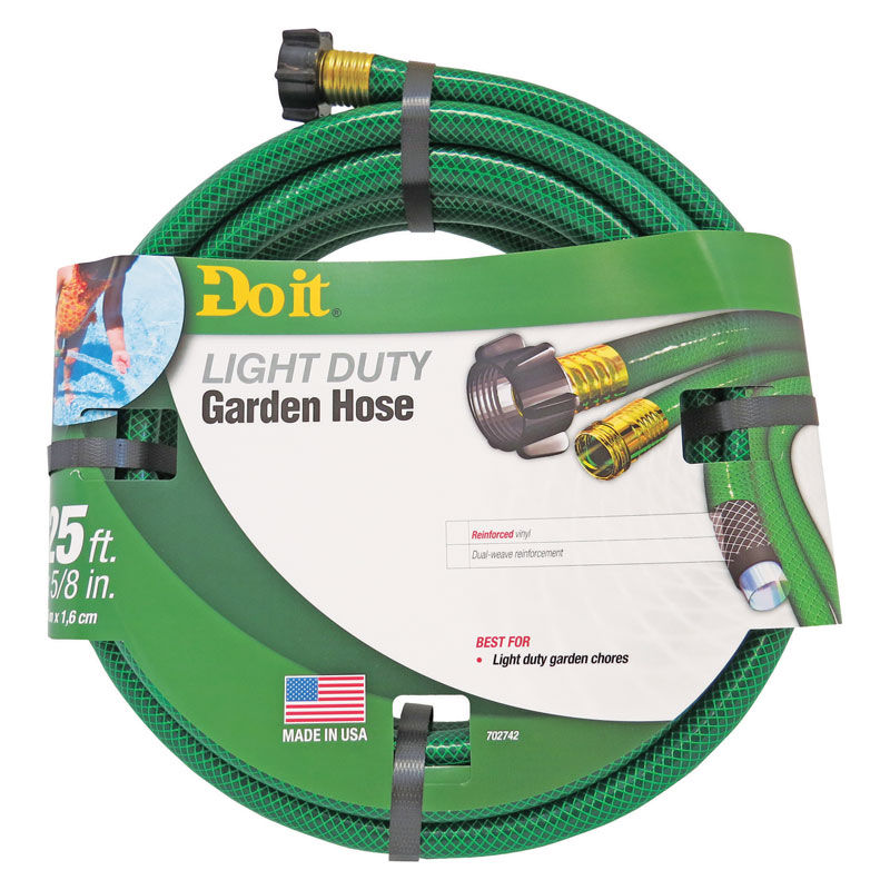 Reinforced vinyl light-duty hose designed with a clear coat outer jacket to help prevent abrasions. The dual weave reinforcement make this hose ideal for all light-duty garden chores. Features an eco brass male coupling and a plastic female coupling. 3V grade. 200 PSI rating.