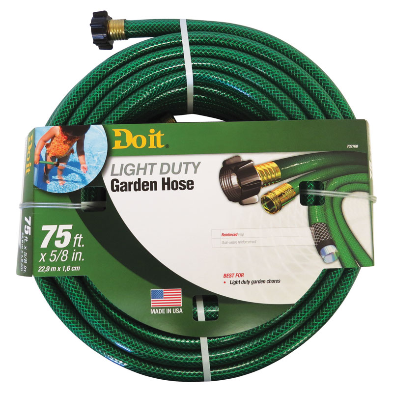 Reinforced vinyl light-duty hose designed with a clear coat outer jacket to help prevent abrasions. The dual weave reinforcement make this hose ideal for all light-duty garden chores. Features an eco brass male coupling and a plastic female coupling. 3V grade. 200 PSI rating.