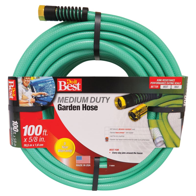Polyester dual-weave reinforcement for better burst performance at 300 PSI. This vinyl garden hose is best for everyday jobs around the house. Designed with a soft-textured, abrasion resistant cover and a patented hose armour kink resistant feature. Lead-free eco couplings.