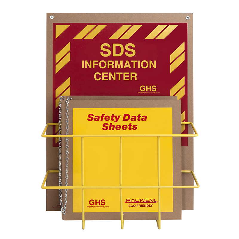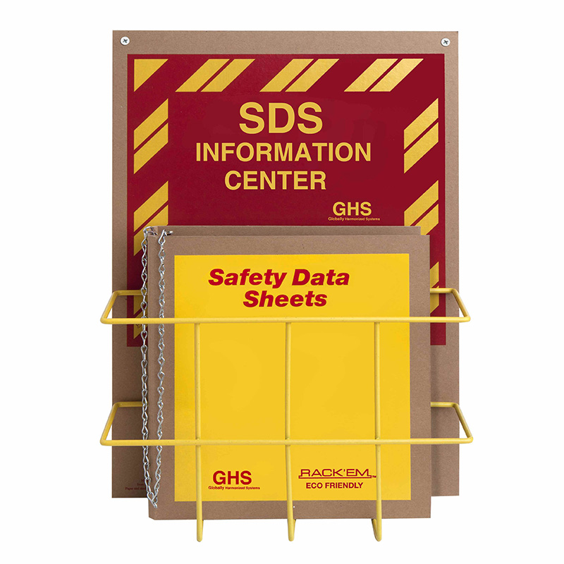 Rack’Em Racks Safety Data Sheets (SDS) Center is Globally Harmonized Systems (GHS) compliant. SDS Center keeps safety data sheets visible, organized, and accessible to all employees. Includes SDS binder with chain, highly visible sign, and wire rack.