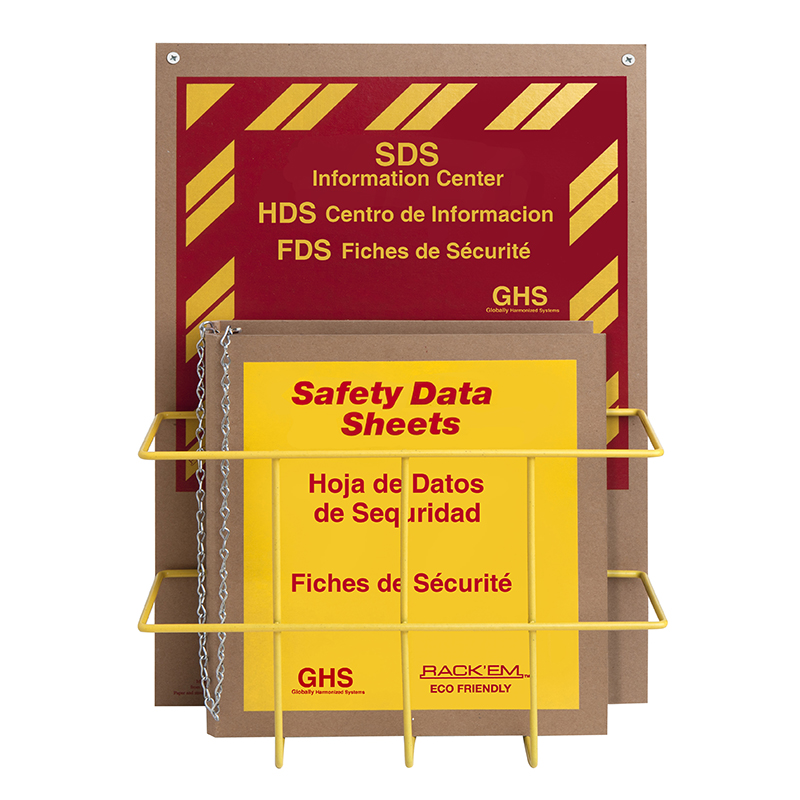 Rack’Em Racks Safety Data Sheets (SDS) Center is Globally Harmonized Systems (GHS) compatible. SDS Center keeps safety data sheets visible,organized, and accesible to all employees. Includes SDS binder with chain, highly visible sign, and wire rack. For dry climates only!