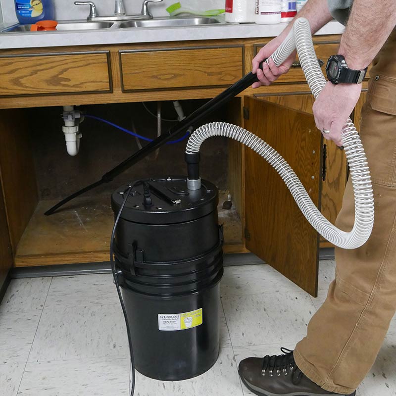 High Capacity HEPA vacuum system is an excellent immediate containment option for large volume pest control applications. This vacuum is configured for PMPs (Pest Management Professionals). The immediate containment five-gallon HEPA filter, manufactured with Pentair brand media is 99.97% efficient at .3 micron and includes three layers of 56 pleat media. The three layers consist of one cellulose layer and two glass layers.