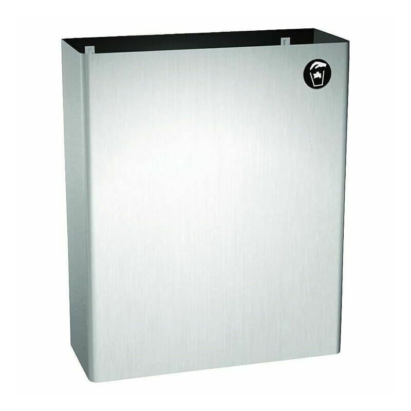 - Stainless steel waste container mounts to wall via 2 key hole slots