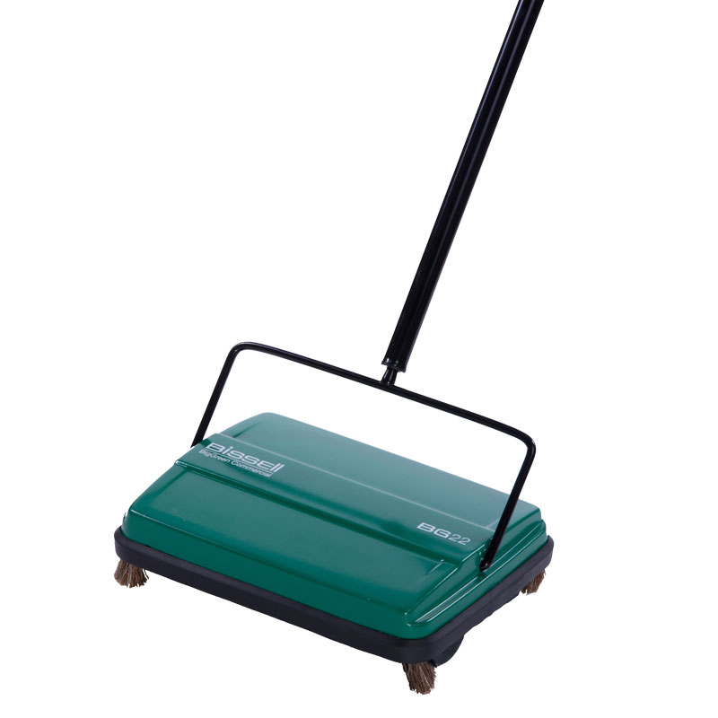 The BG22 manual sweeper is great for foodservice cleaning in restaurants and kitchens. The soft rubber wheels conform to a variety of floor surfaces, making this manual sweeper ideal for cleaning low pile carpet and bare floors. The BG22 model features a single rubber brush for cleaning up wet messes in the kitchen.