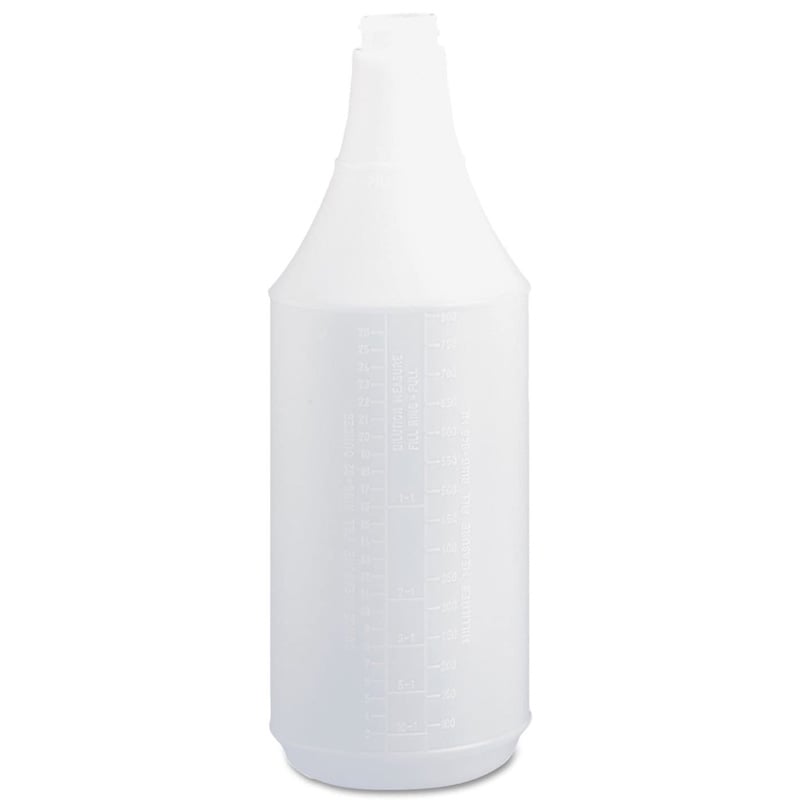 Clear bottle with embossed scale encourages user to properly proportion chemicals from larger containers and when mixed with water. Sleek, tapered neck bottle provides a more comfortable grip when used with a trigger sprayer. Easy-to-use, multi-purpose bottle for general-purpose cleaning in kitchens, bathrooms, offices, schools, and industrial settings. Securely holds cleaning solvents and water without spilling. Trigger sprayers sold separately.