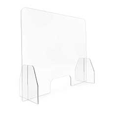 The Physical Barrier with a wide base provides stability, and attached rubber feet protect the surfaces. This protective barrier, constructed in the USA, is made of clear polycarbonate plastic and a PVC hinge. The small support legs insert into the barrier for portability and quick setup, and folds flat for convenient storage. For the hinged type, a flexible hinge bends to create a protective barrier between seated personnel. Multiple barriers can be used to section off areas of a table. The pass-through opening at the bottom lets you easily exchange items while protecting the users. This protective barrier is available in medium, small, and large sizes.