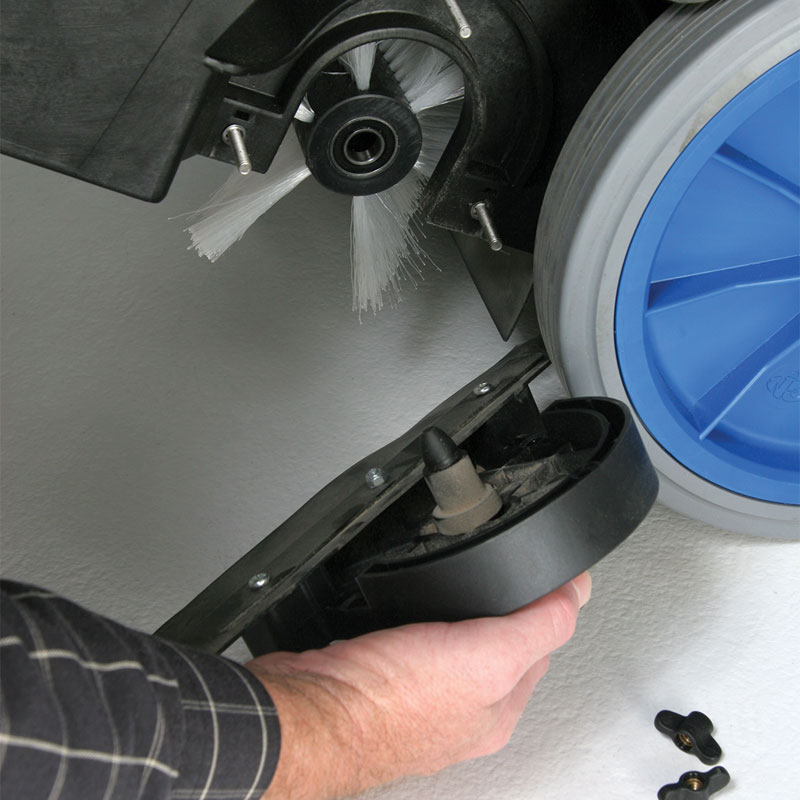 Broom Maintenance No tools required for changing, inspecting or adjusting the main broom | Cleaning Brooms A black multi-purpose nylon main broom comes standard. An optional carpet broom is available. | Simple Operation A single switch and battery level indicator allows for minimal operator training. |