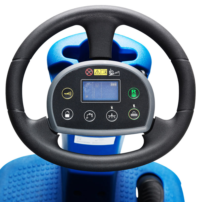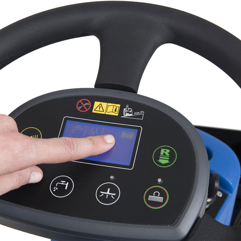 Steering Wheel Control Panel User-friendly and easy-to-learn dashboard with One-Touch button and intuitive display integrated into the steering wheel. Exclusive multifunction digital display allows for maximum customization of machine settings. | CMS Control Button The Chemical Mixing System (CMS) automatically mixes adjustable levels of concentrated chemicals stored in an onboard resevoir with clean water stored in the solution tank. | Onboard Squeegee Storage Built-in squeegee hanging system on tank allows for safe transportation through doorways and tight areas, while permitting tank drying. |