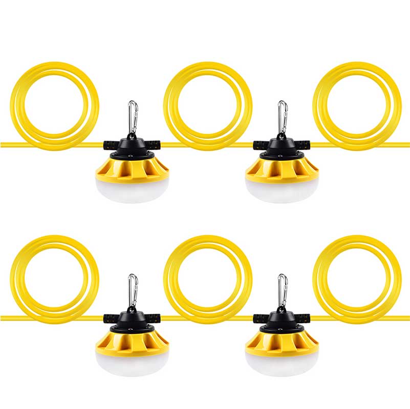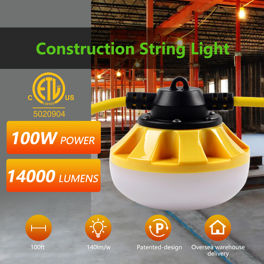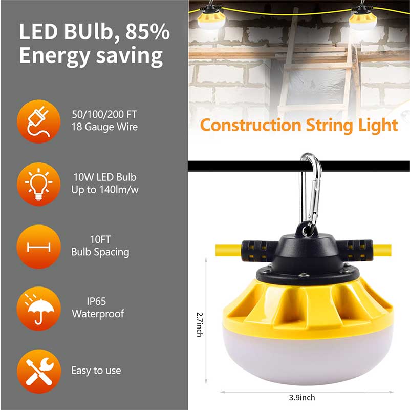100 foot temporary light string ideal for indoor or outdoor lighting. Features: 50-foot extension cord style stringer with 10 enclosed lamp holders with LED lights. Temporary indoor and outdoor stringer illumination for temporary job sites, attics, garages, unfinished construction, outdoor parties or events, and more. Lamp holder spacing is every 10-feet, starting 4-feet from the plug. Includes attachment plug cap, hanging clips and cord end connector. Highly visible yellow lamp for added visibility and safety. 18/2-gauge SJTW power cord is durable and withstands moisture, abrasion, chemicals, and prolonged exposure to ultra violet rays. Industry approvals: ETL.