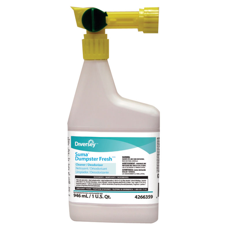 The Suma Dumpster Fresh Treatment can be used as a deodorizer for dumpsters, trash cans, loading docks and concrete floors. Noticeably reduces the smell of garbage. Three-part treatment offers strong cleaner, deodorizer and bio-active, non-pathogenic (non-disease causing) formula that quickly goes to work creating enzymes to digest grease and other organic soils. Applied bacteria keep odors from coming back. Requires no scrubbing, just spray and walk away.